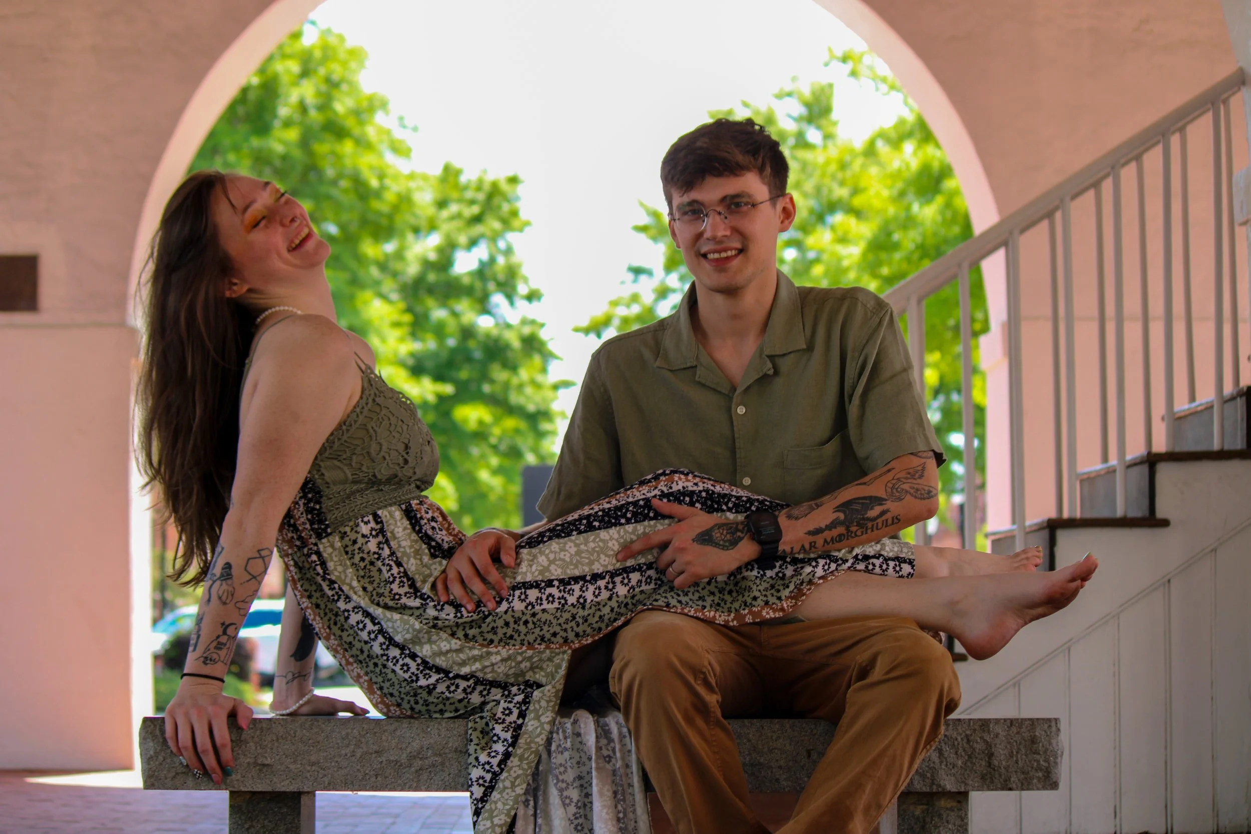 A young man with glasses and tattoos is sitting on a bench, holding a young woman with tattoos on her arms and legs, who is sitting sideways on his lap, laughing. They are outdoors, with green trees and a bright sky visible through an arched opening