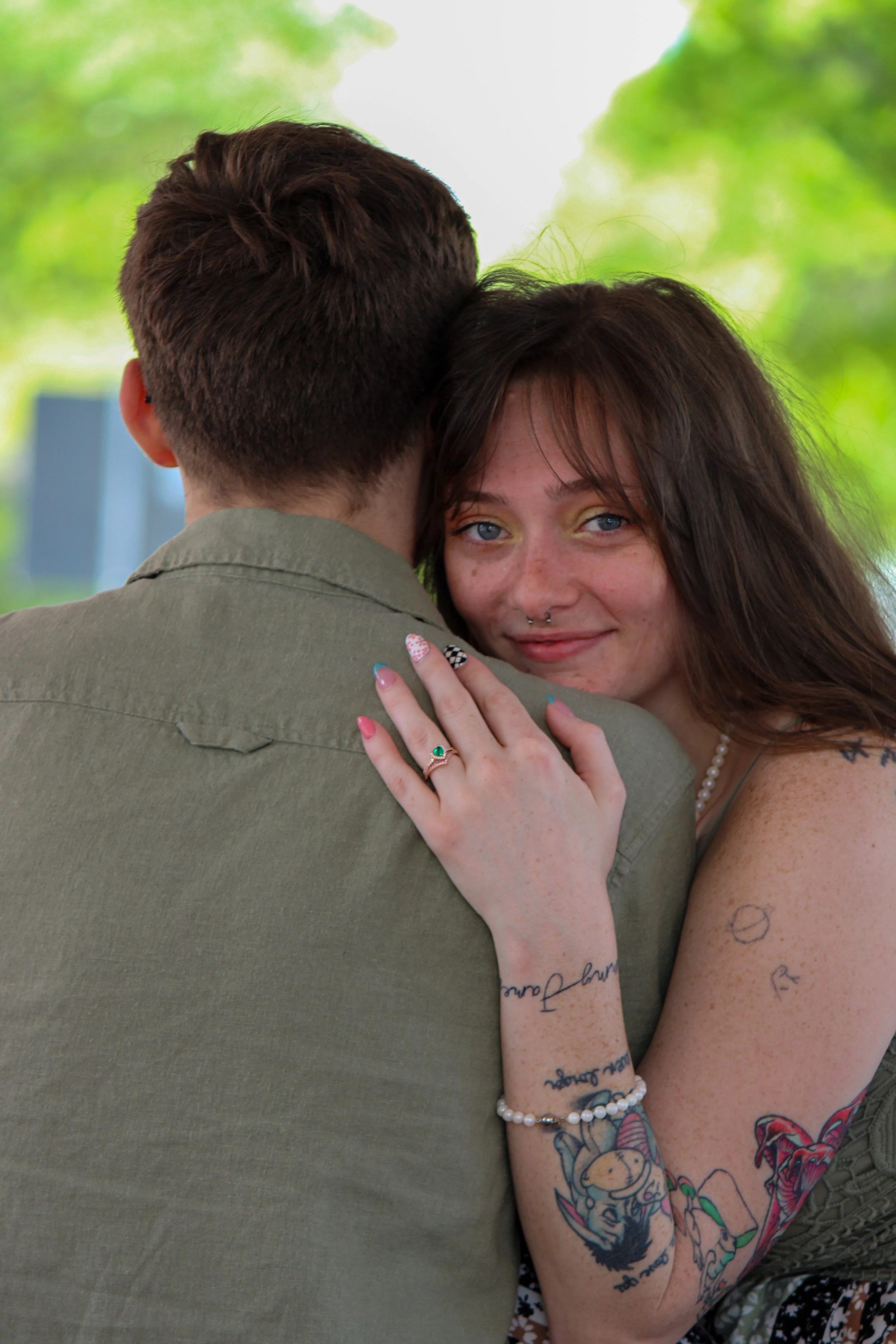 A woman with tattoos and colorful nails hugging a man from the front, smiling and resting her head on his shoulder, with a background of green trees. Fayetteville, NC