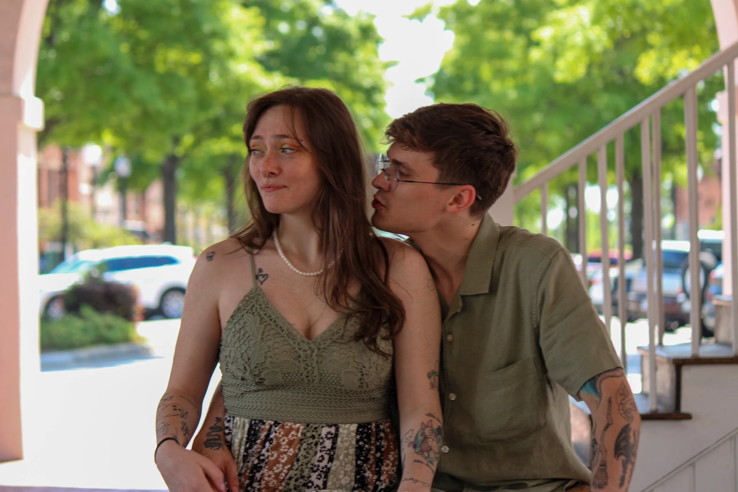 A young woman with tattoos and a necklace looks to her left with a slight smile, as a young man leans in to kiss her on the cheek, set outdoors on a sunny day with green trees, cars, and stairs in the background. Fayetteville, NC
