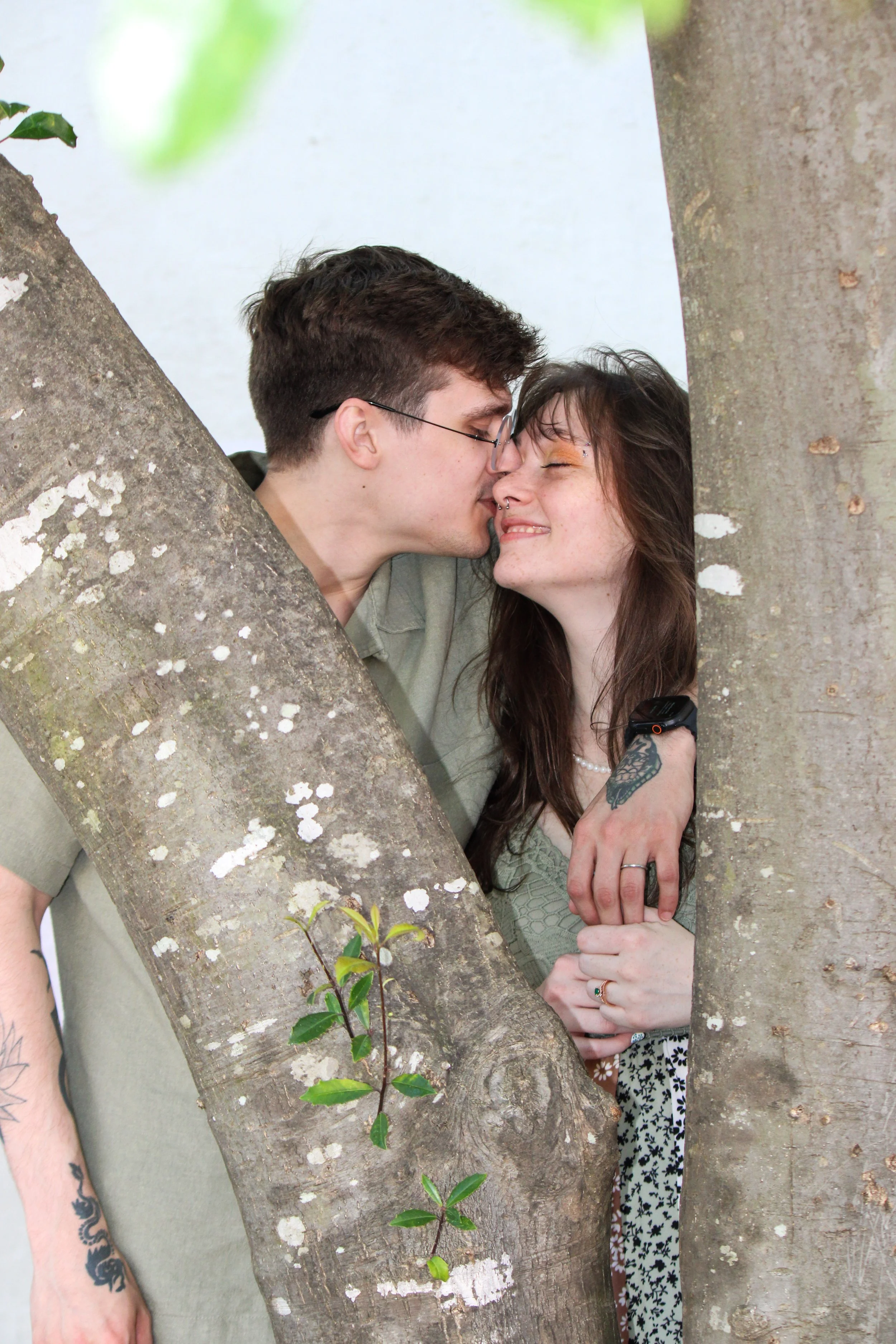 A young couple kissing, with the woman wearing a pearl necklace and tattoos on her shoulder and arm, and the man wearing glasses and a green shirt, against a background of green trees. Fayetteville, NC