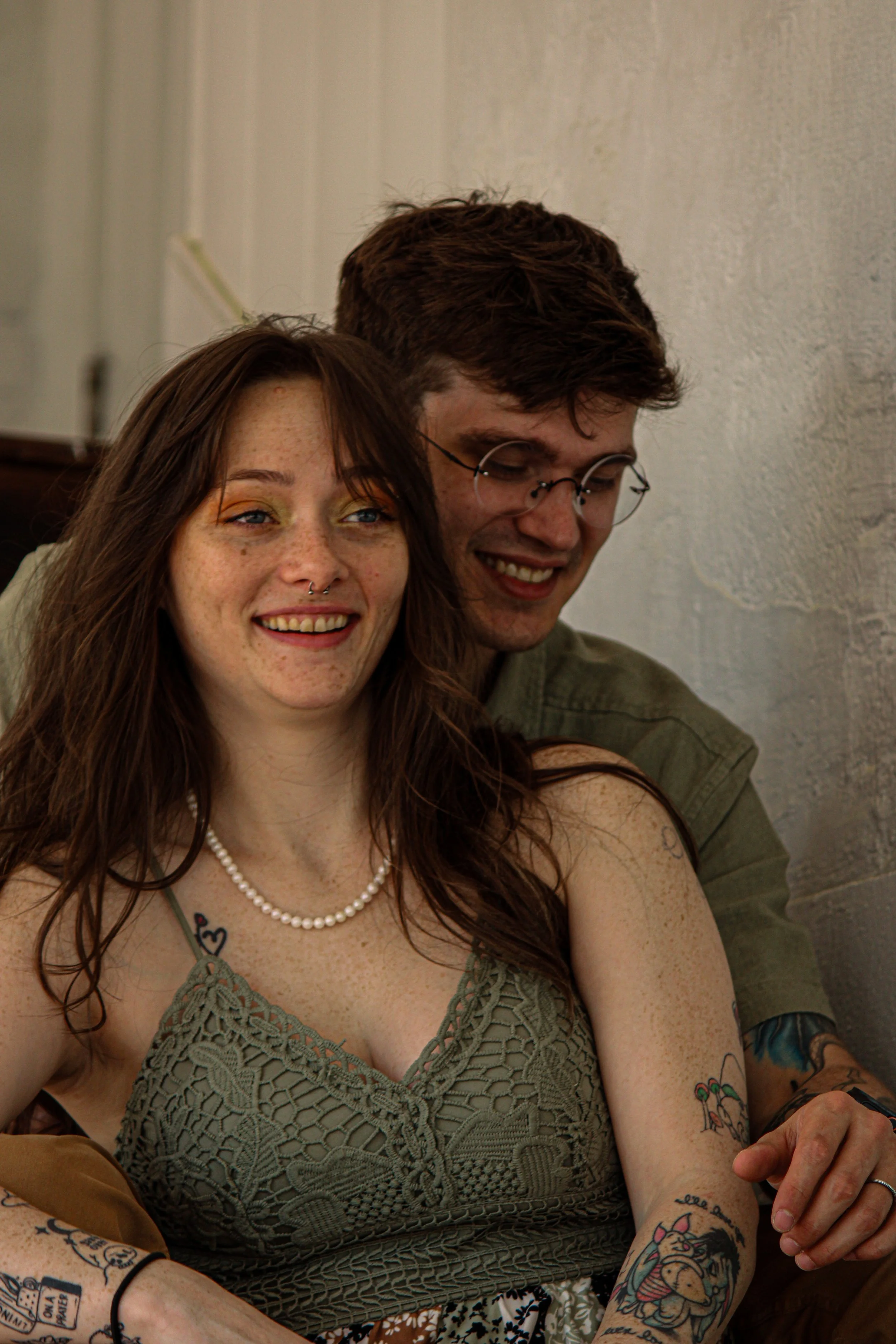 Close-up of a smiling young woman with freckles and tattoos, wearing a lace top and pearl necklace, with a young man smiling behind her, both sitting against a wall. Fayetteville, NC