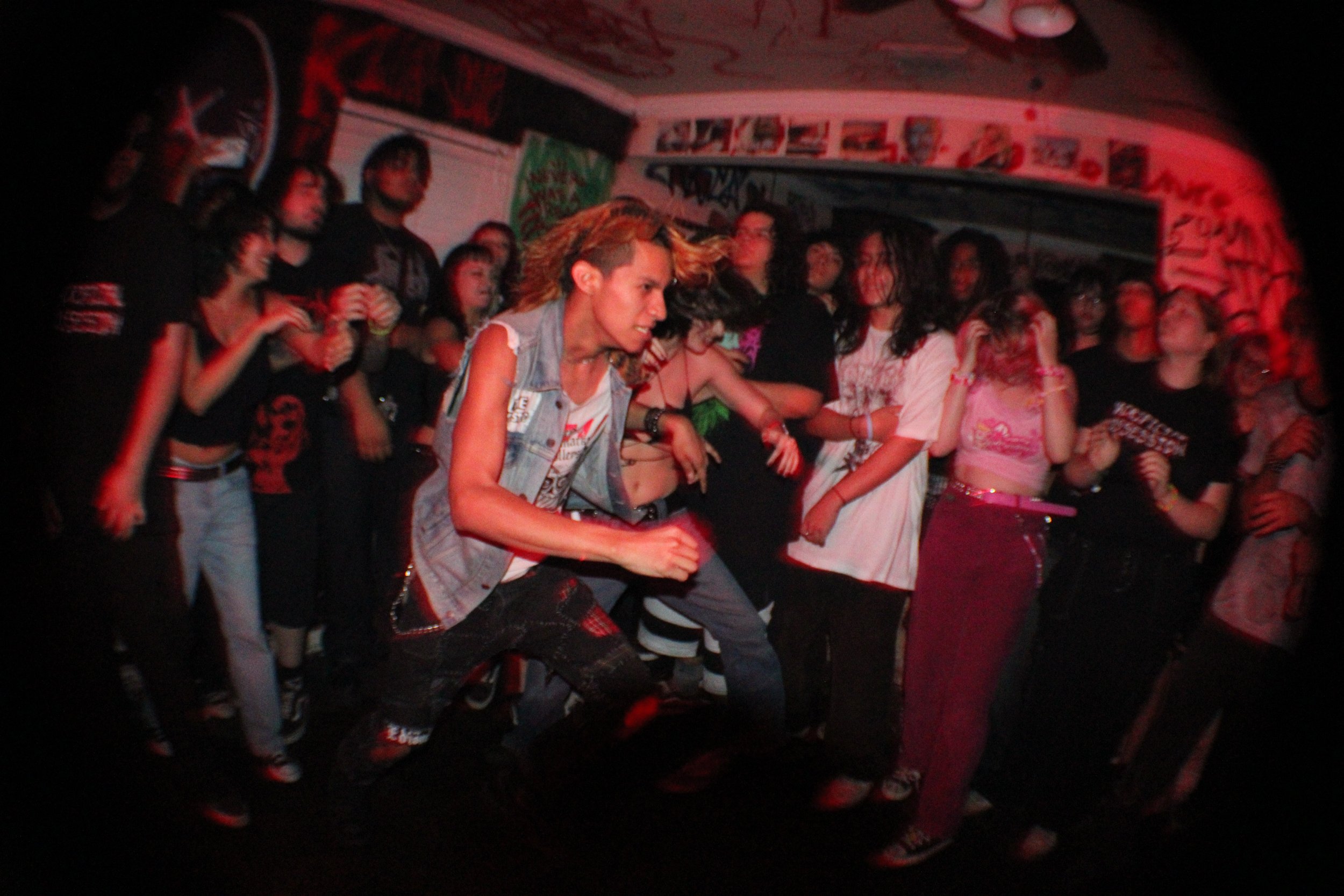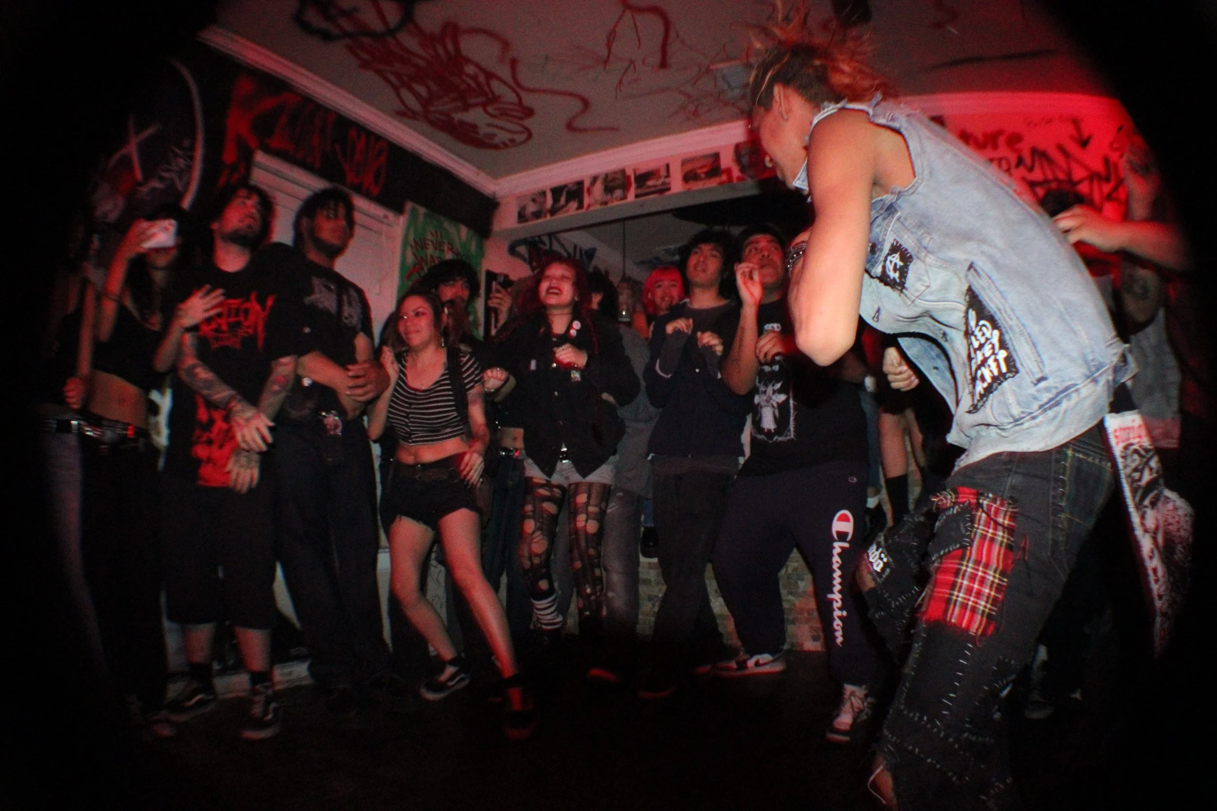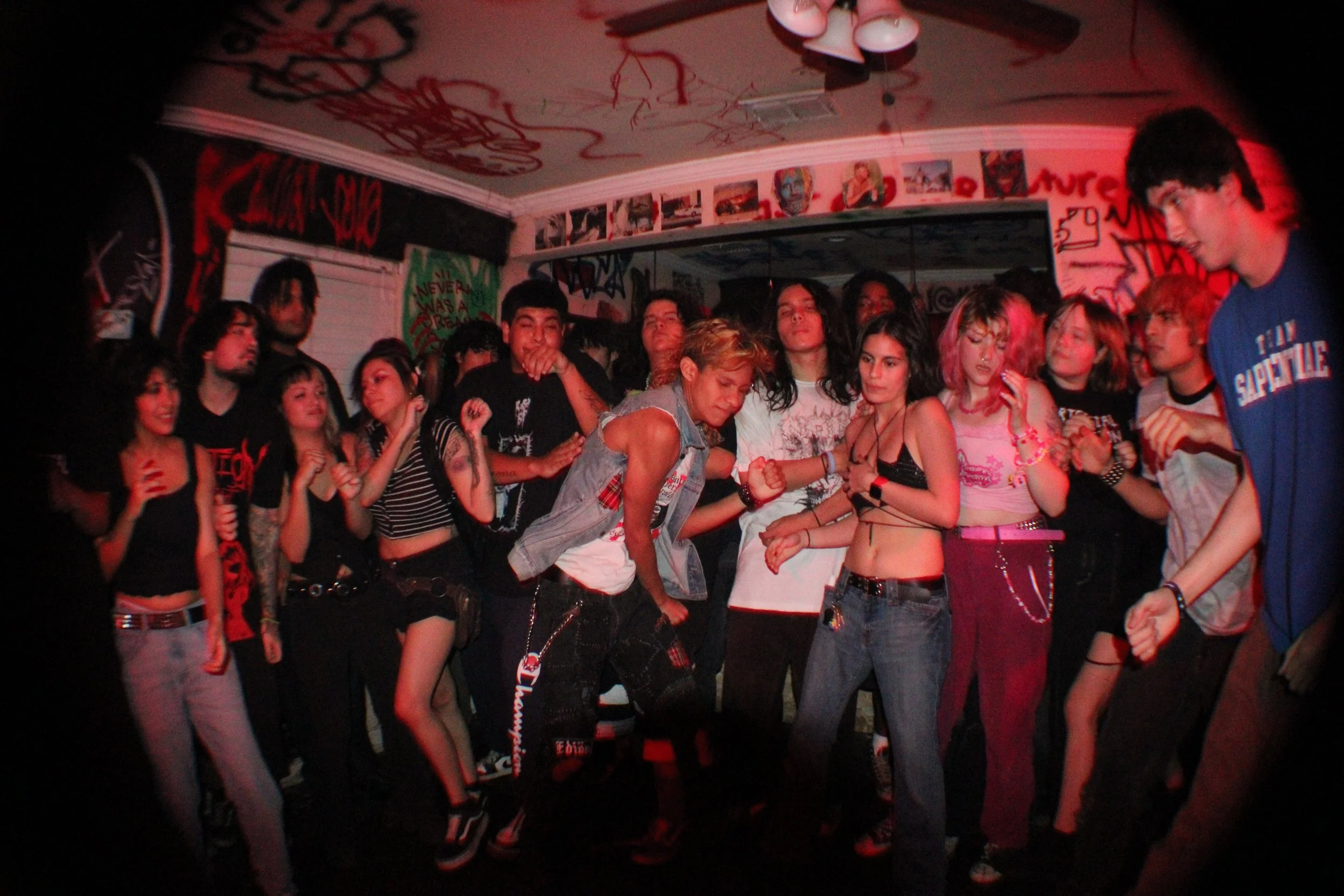 Group of young people at a punk rock concert or party, dancing and enjoying music in a dimly lit room with graffiti-covered walls.