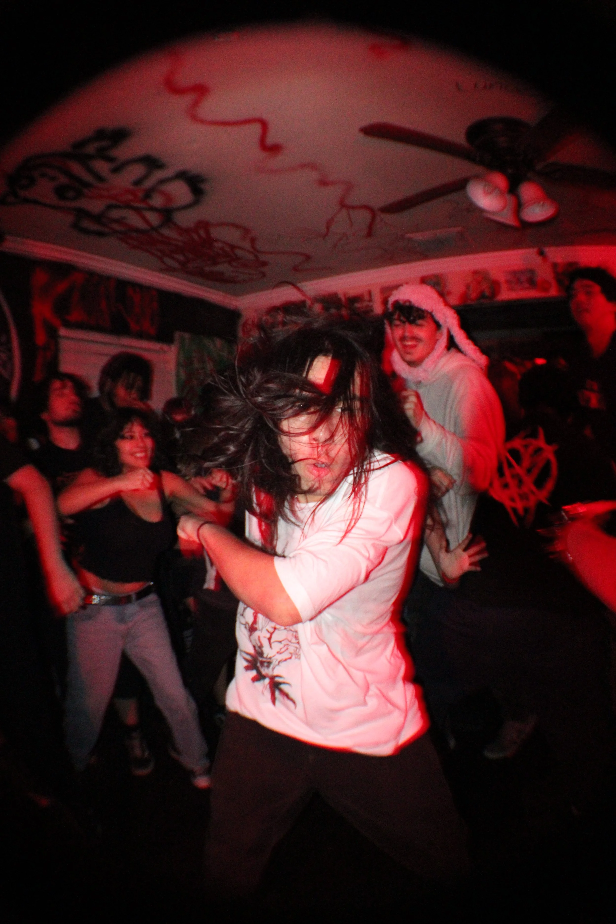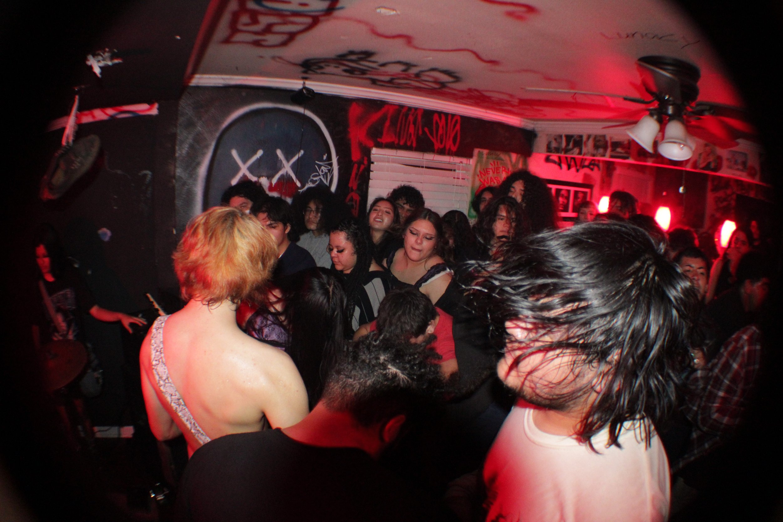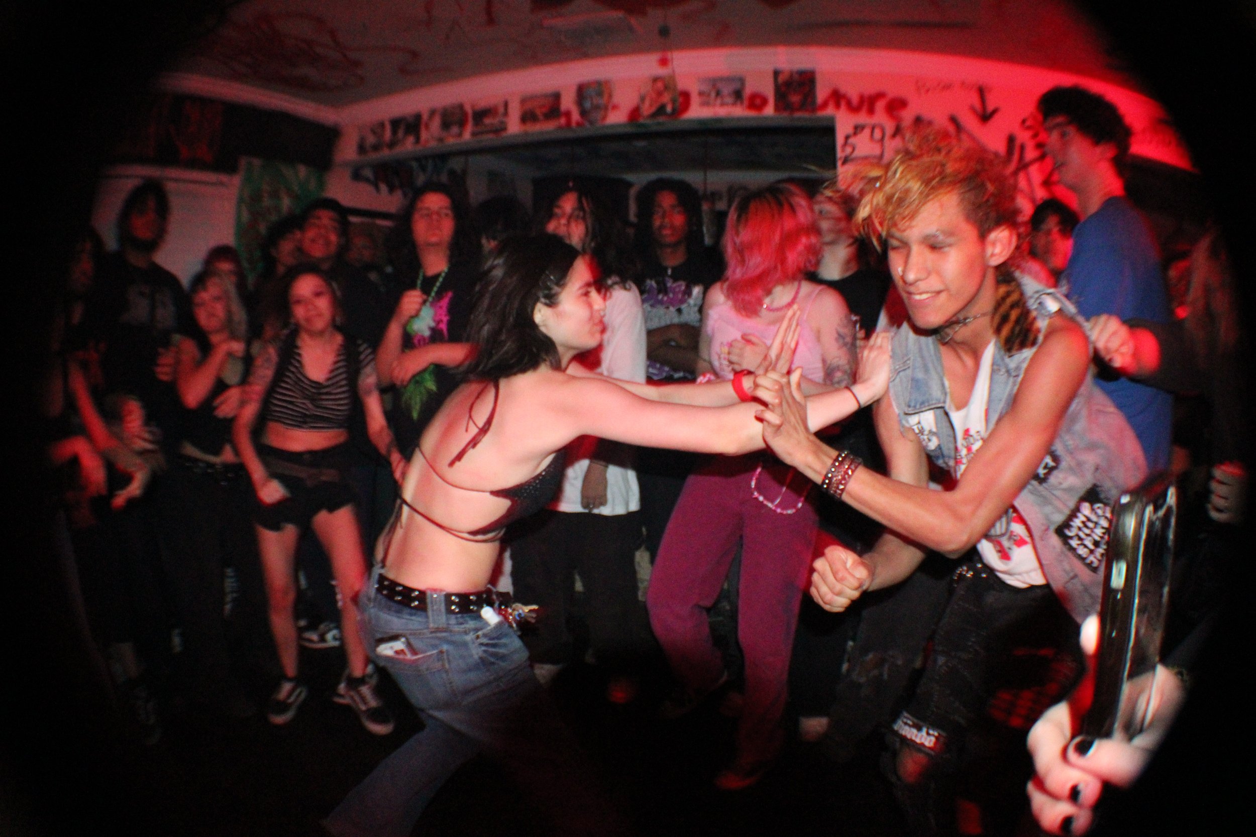 People dancing and socializing in a graffiti-covered room, typical of a punk or underground music scene. Graffiti House, San Antonio, TX