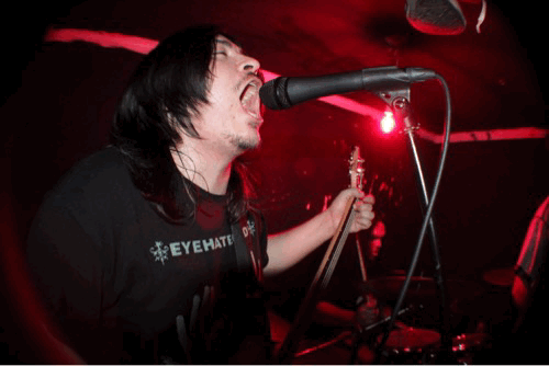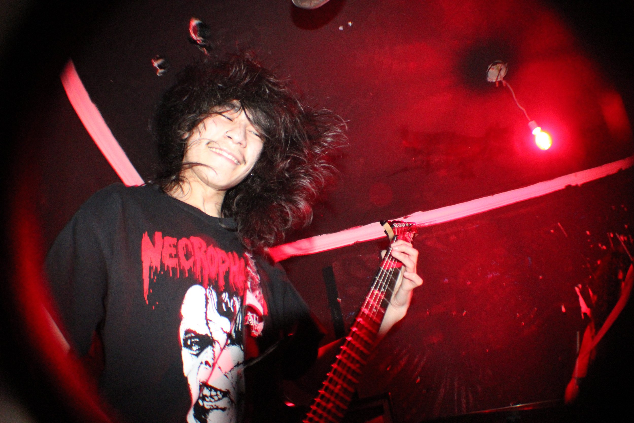 A person with long dark hair playing an electric guitar on stage, wearing a black T-shirt with a graphic and red text, with red lighting in the background. Graffiti House, San Antonio, TX