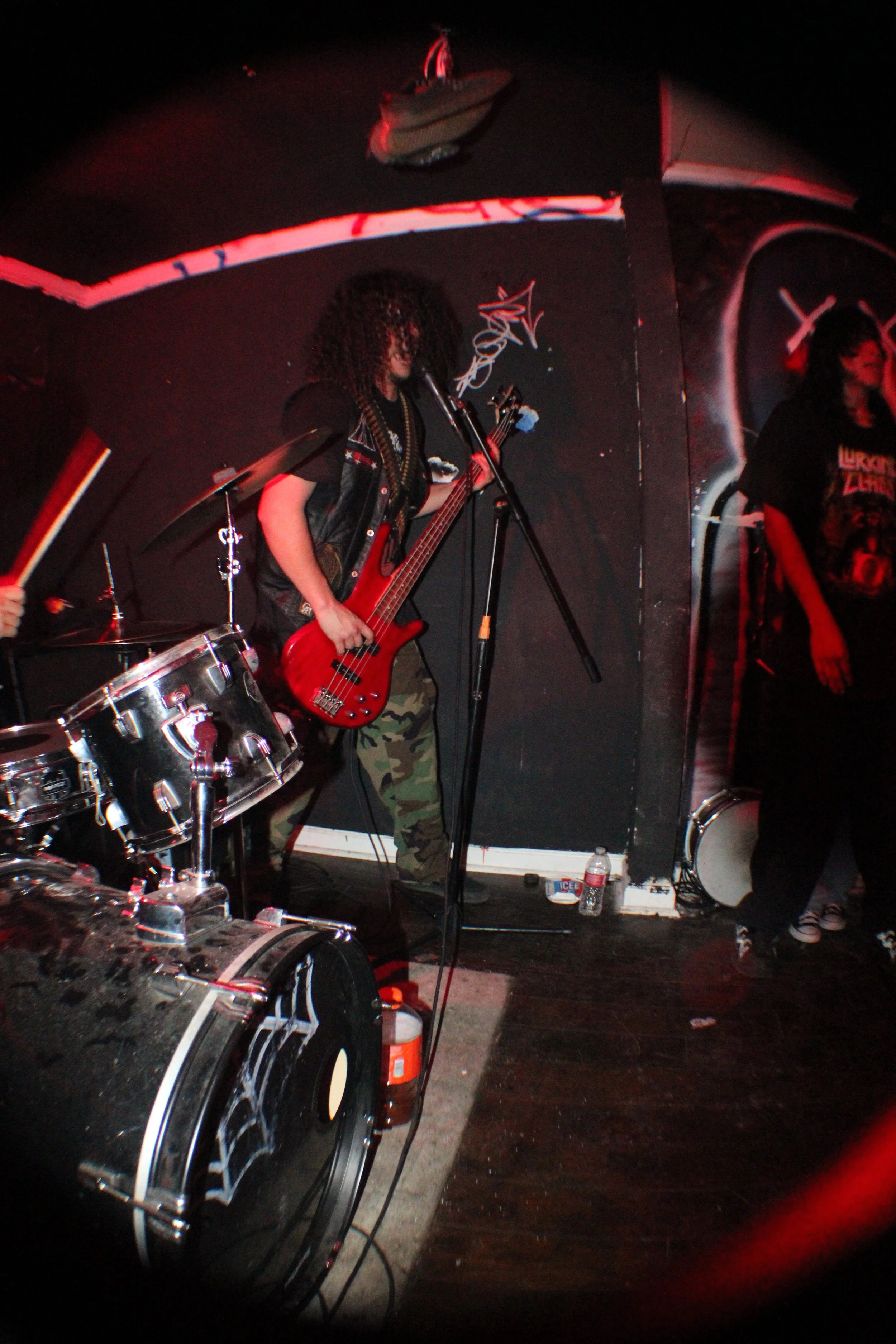 Two musicians perform indoors; one playing drums and the other playing bass guitar in a dimly lit setting with red lighting. Graffiti House, San Antonio, TX