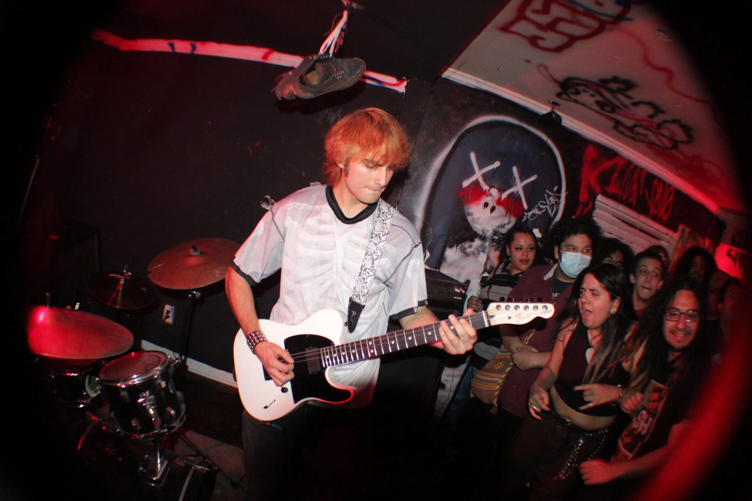 A young man with red hair playing an electric guitar during a live music performance at an underground venue. The background features graffiti art and a small audience watching with interest. Graffiti House, San Antonio, TX