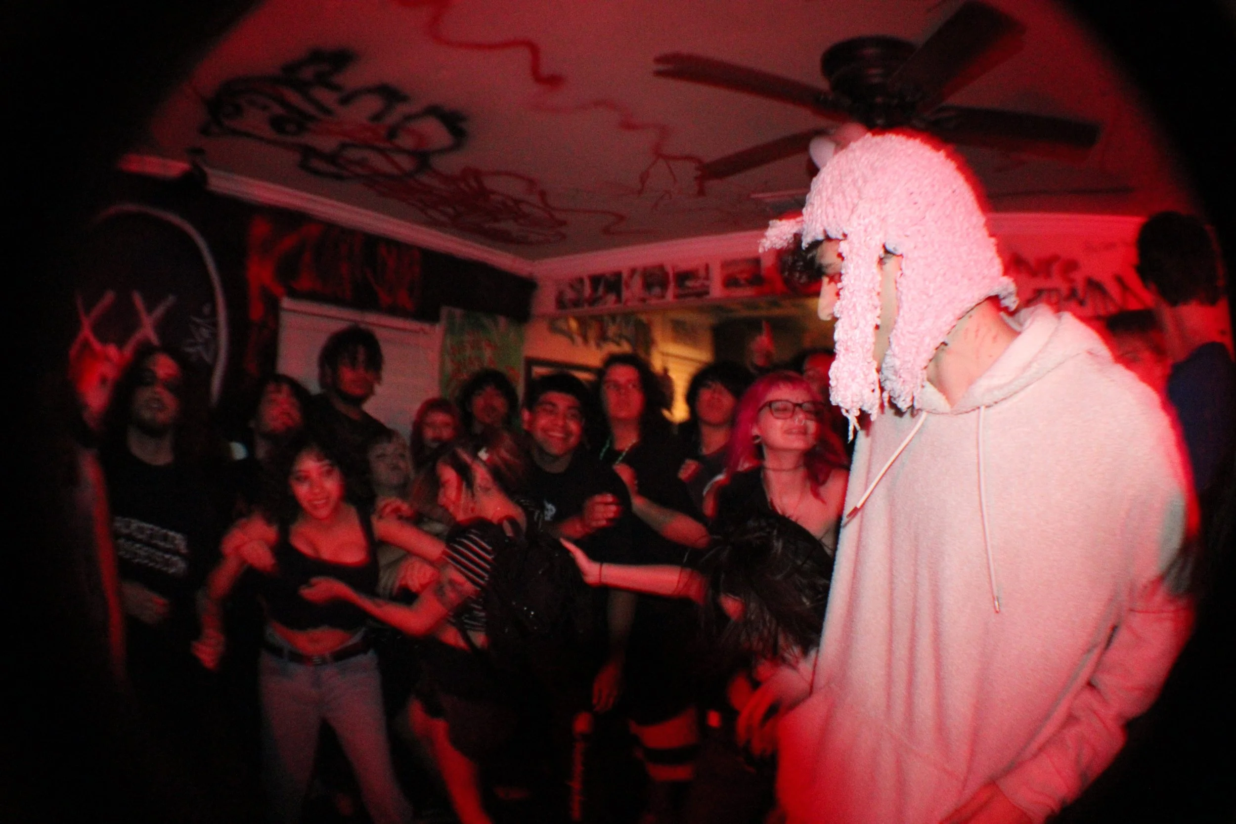 A person wearing a pink, fluffy unicorn mask and hoodie stands in a dimly-lit room filled with people. The group appears to be at a party or concert, with graffiti-covered walls, graffiti art, and a serious expression on some faces. Graffiti House