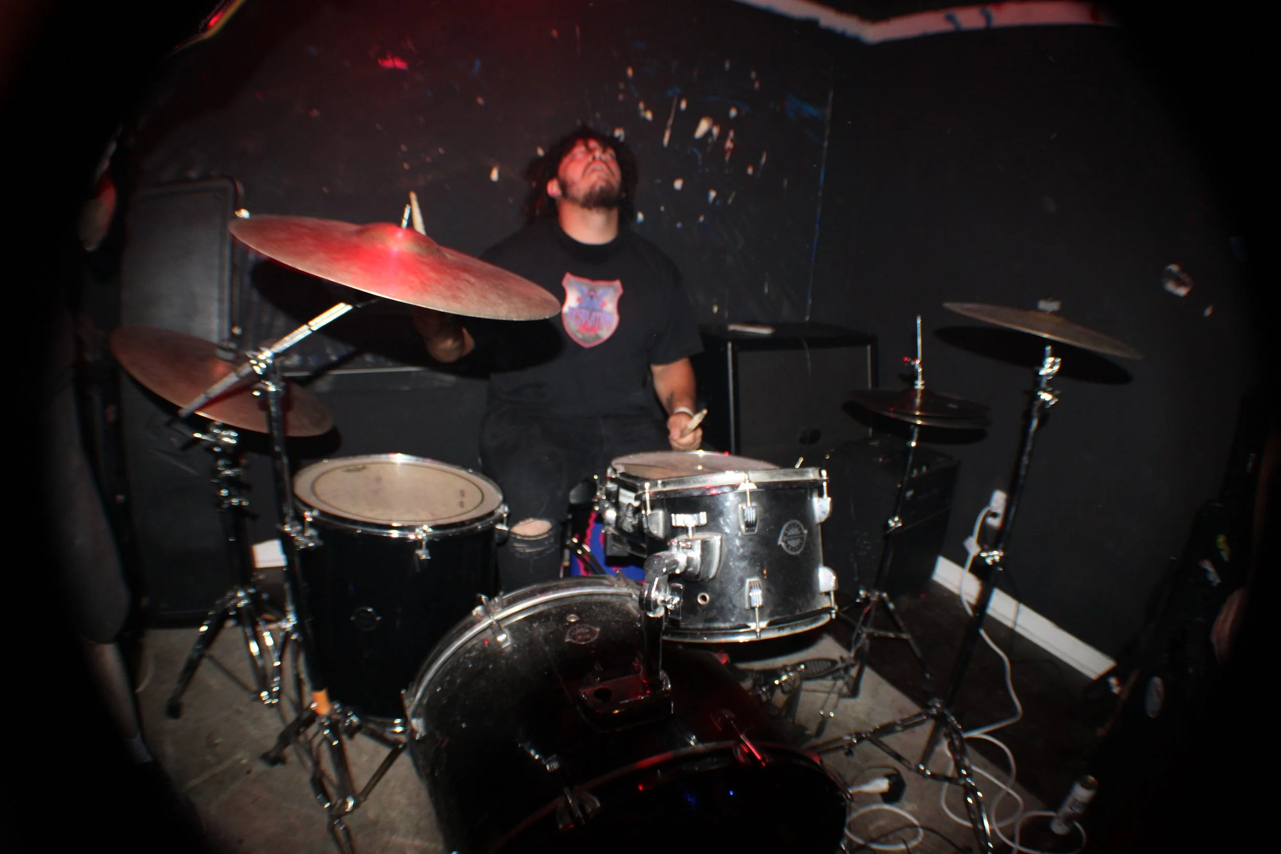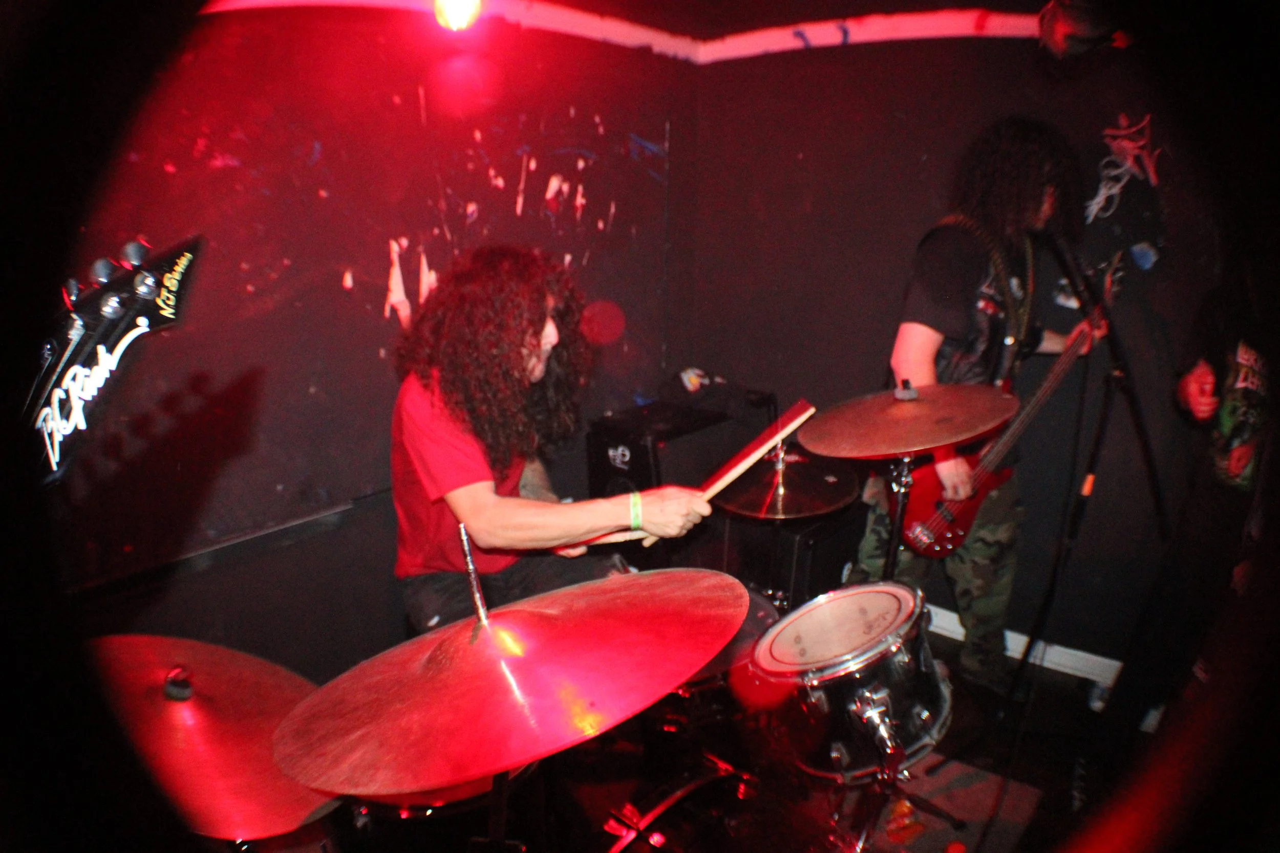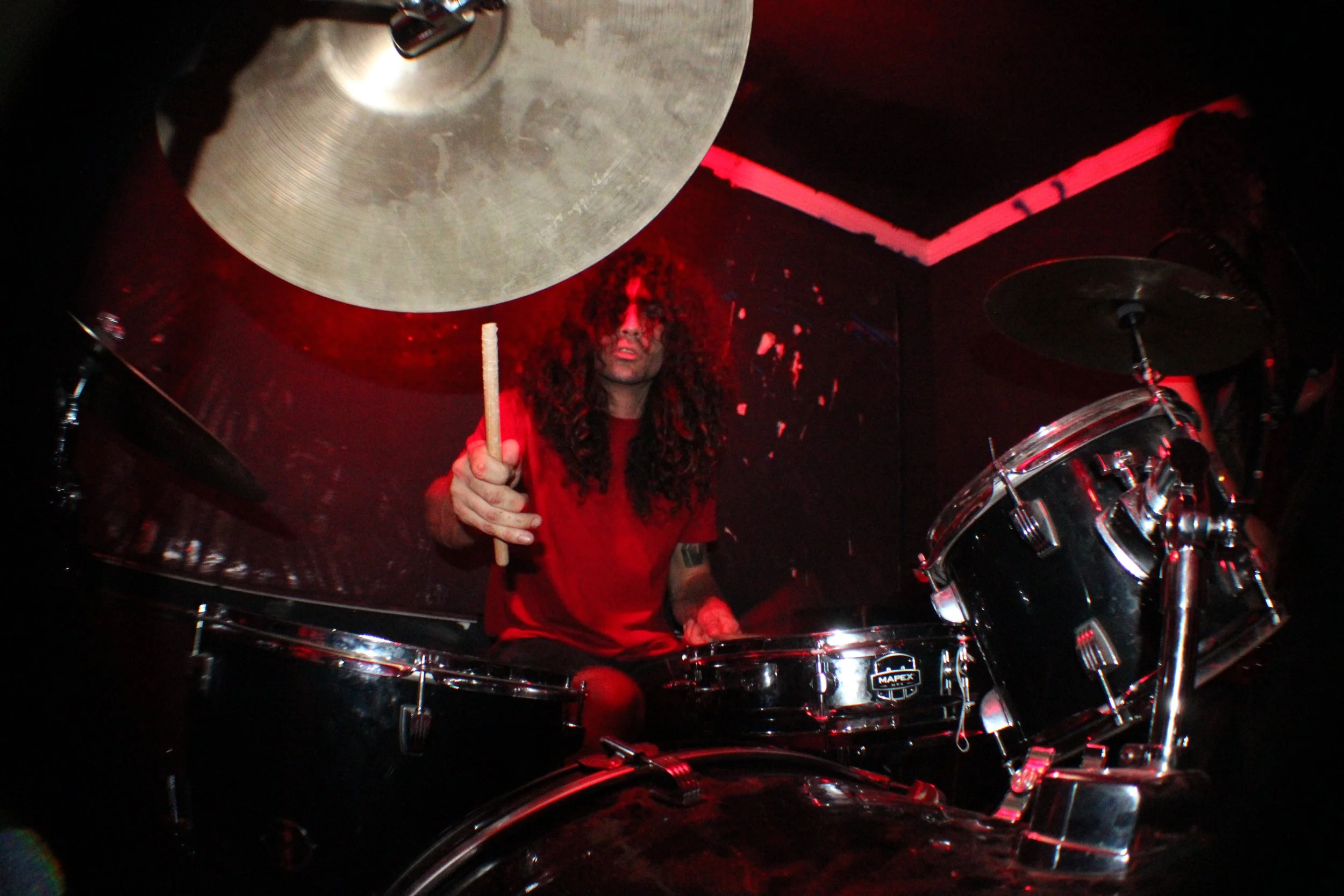 A man with long curly hair playing drums in a dimly lit room with red lighting. Graffiti House, San Antonio, TX