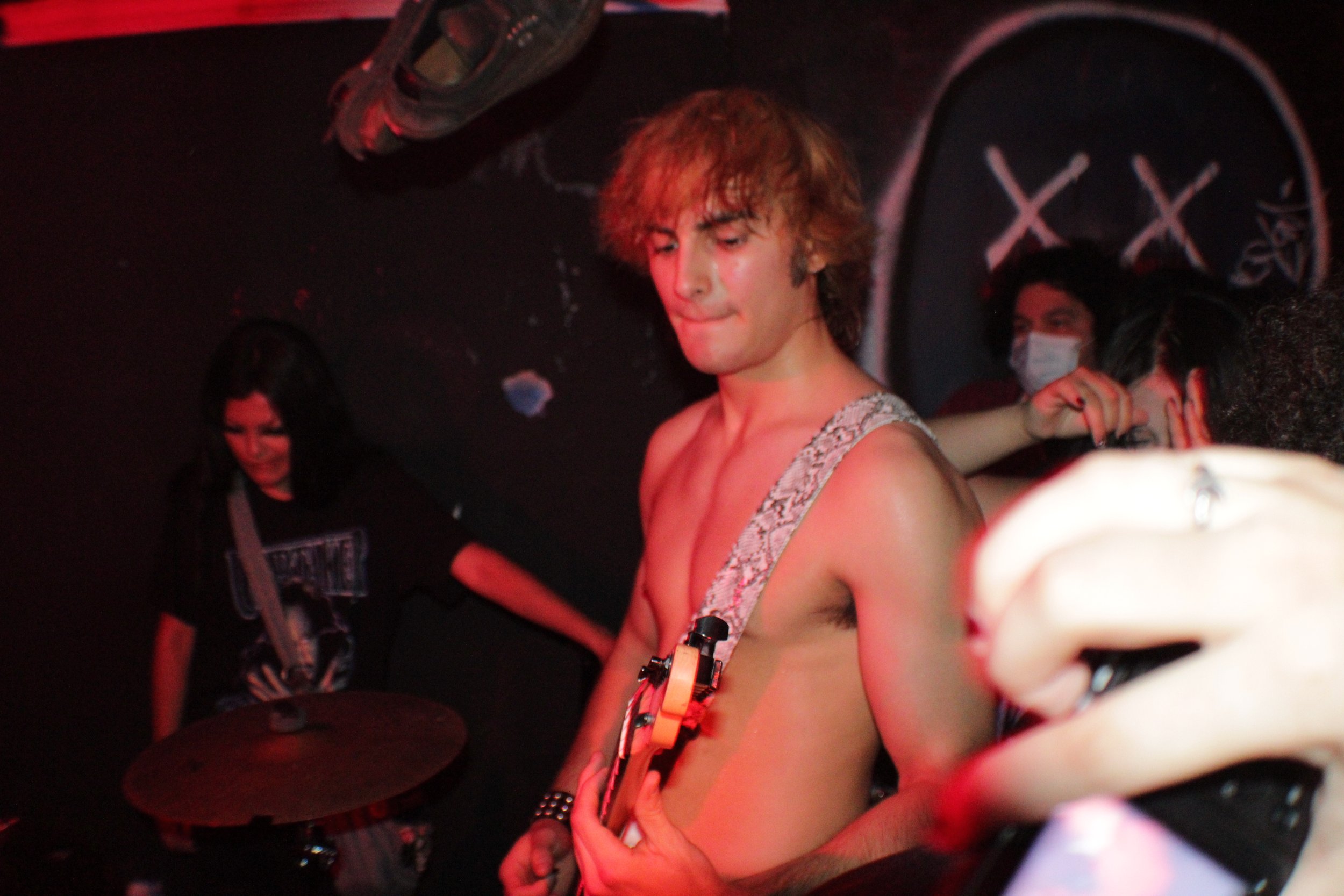 A young man with curly light brown hair is playing an electric guitar on stage, shirtless, during a live music performance. The background is dark with some people and graffiti-style artwork on the wall. Graffiti House, San Antonio, TX