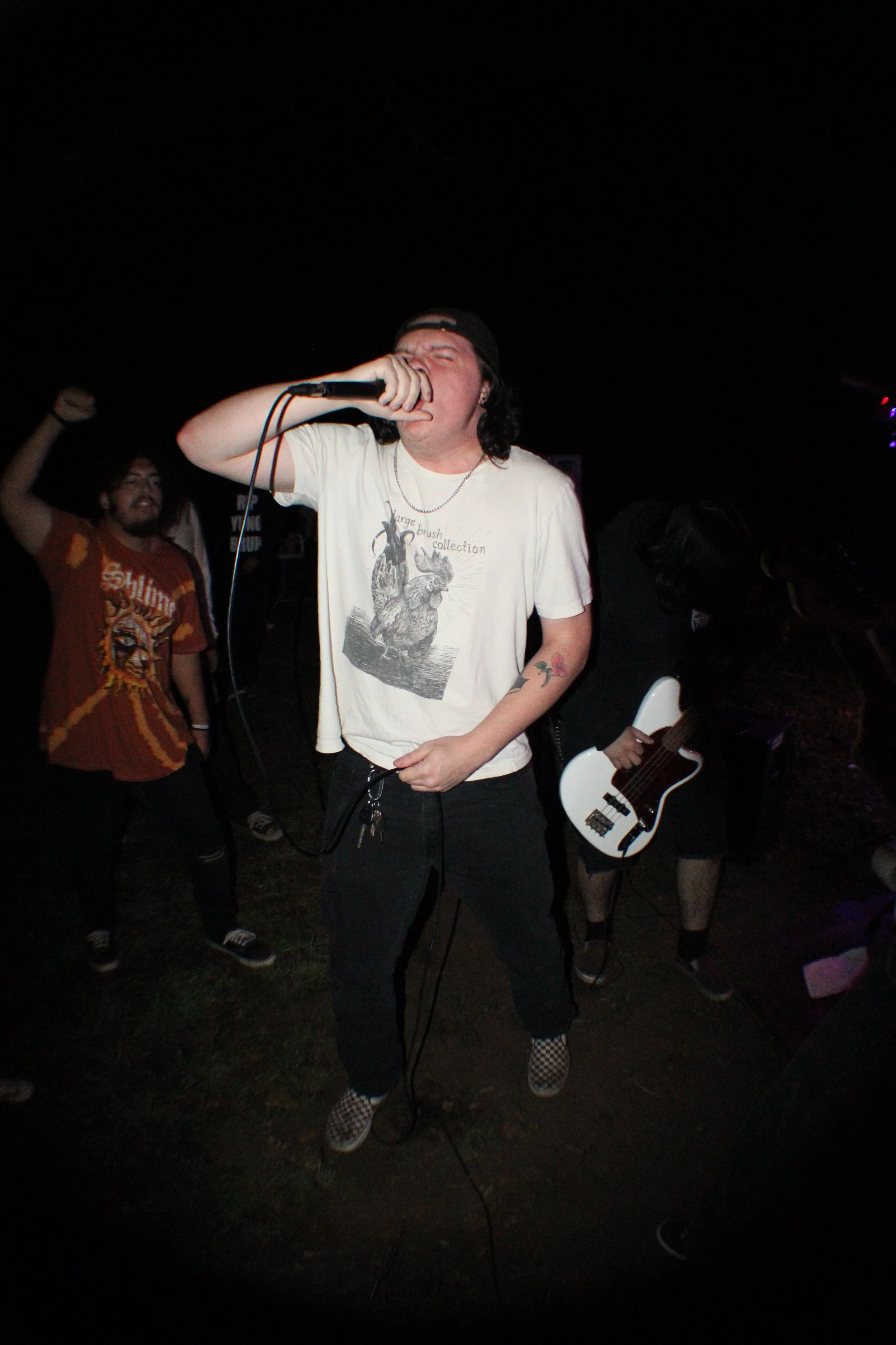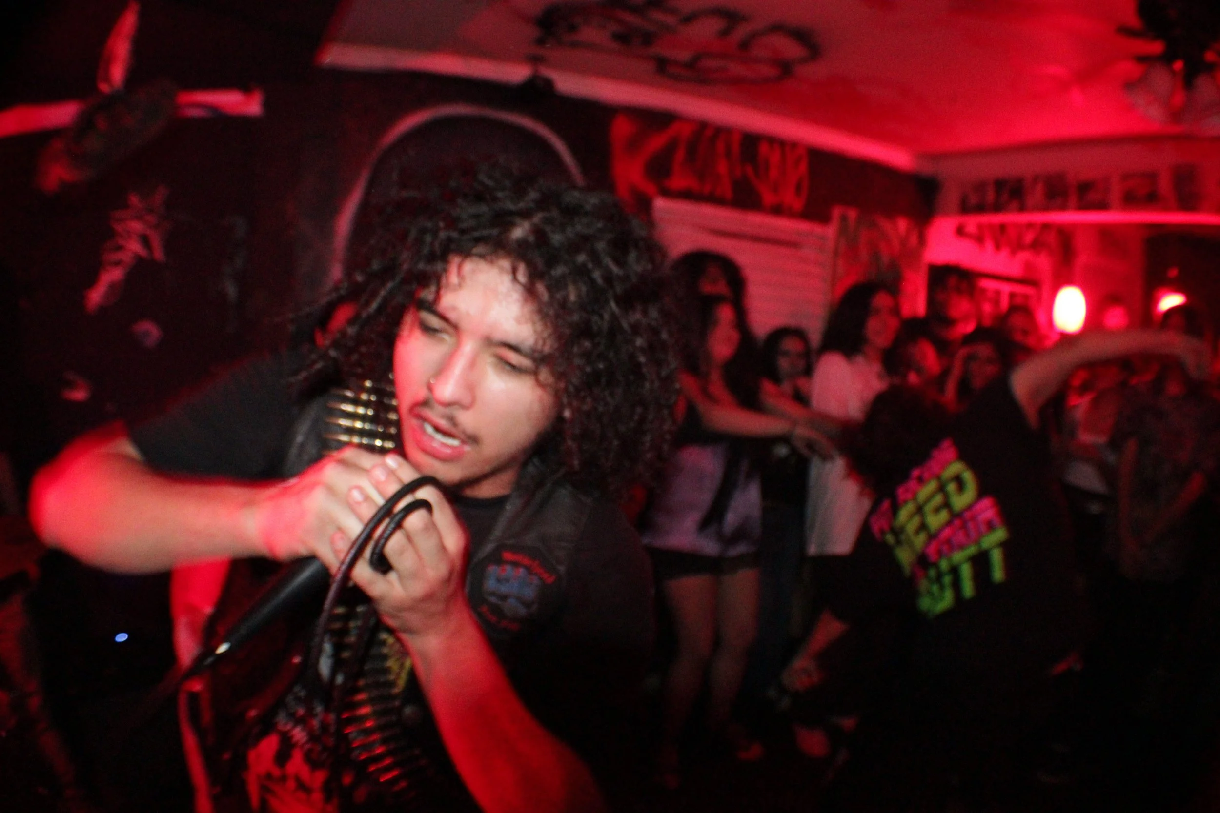 A person with long dark hair singing into a microphone at a concert, with others playing instruments and dancing in the background. Graffiti House, San Antonio, TX