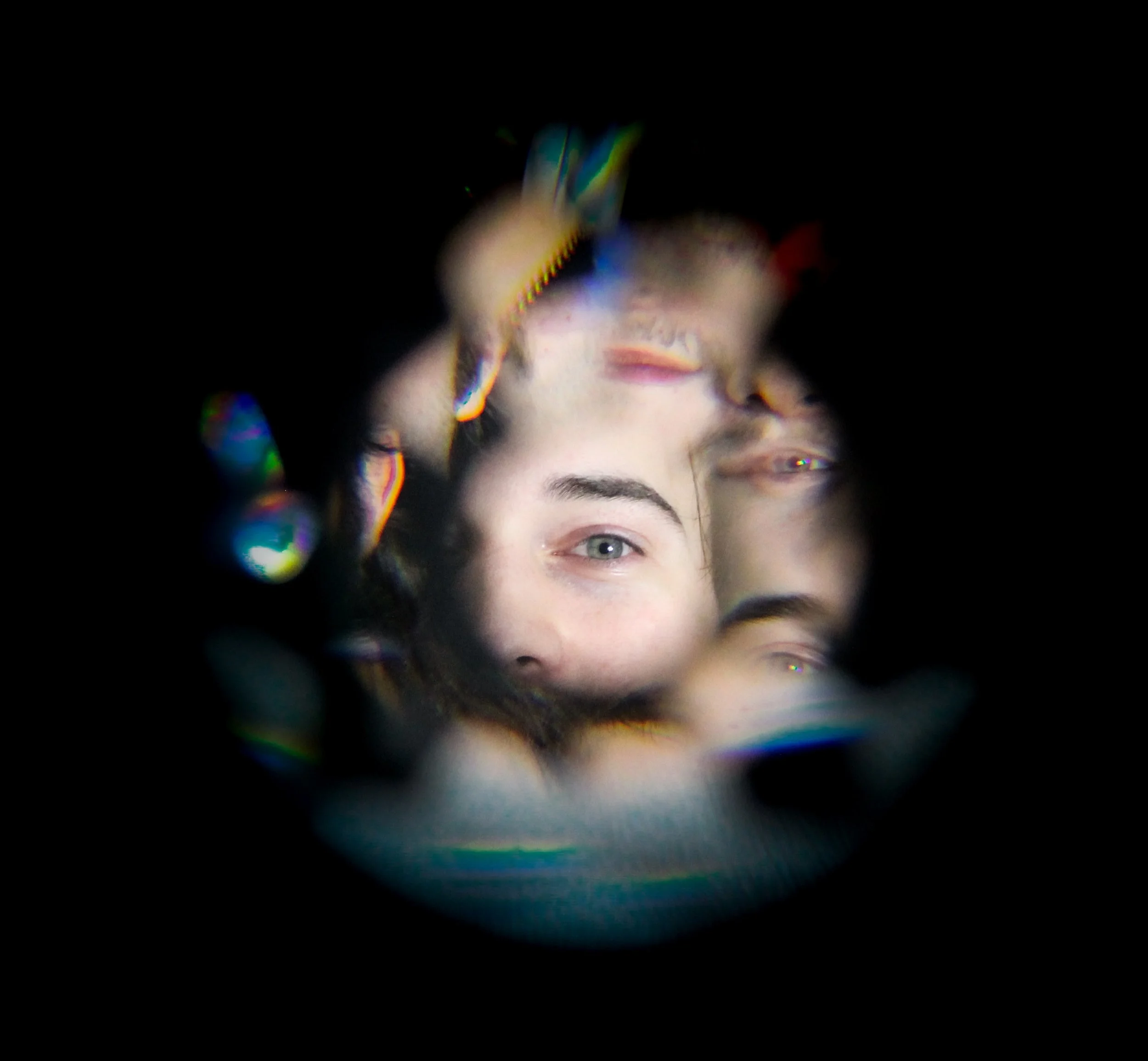 Close-up view of a man's face reflected in a rippling, circular, glass or crystal surface, creating a distorted, abstract appearance with dark background.