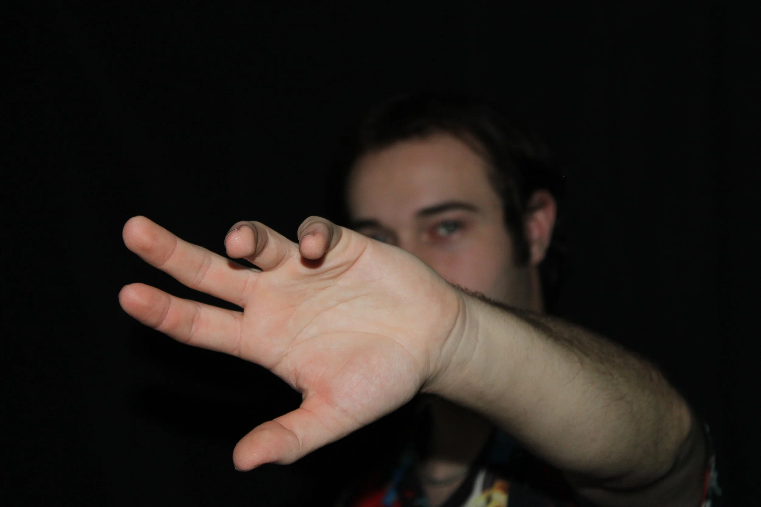 Person reaching out hand towards the camera with fingers spread, partially obscuring face against a black background.