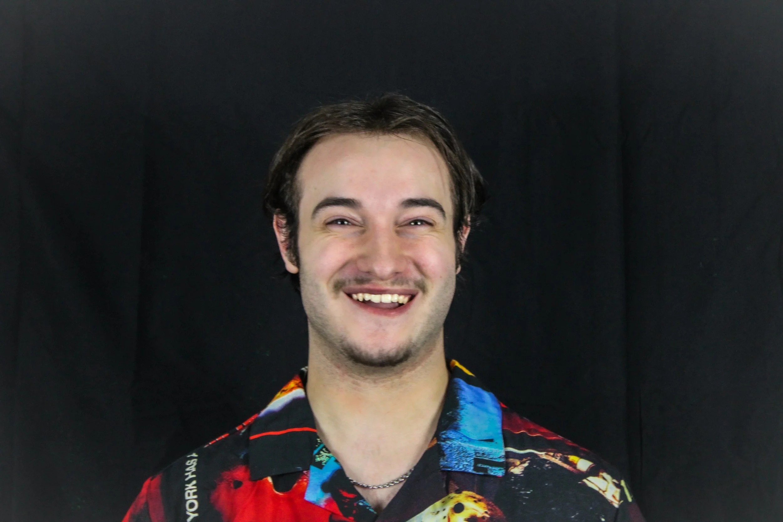 A young man with short brown hair, a light beard, and a mustache, smiling against a black background. He is wearing a colorful Hawaiian shirt with red, black, blue, and yellow patterns.