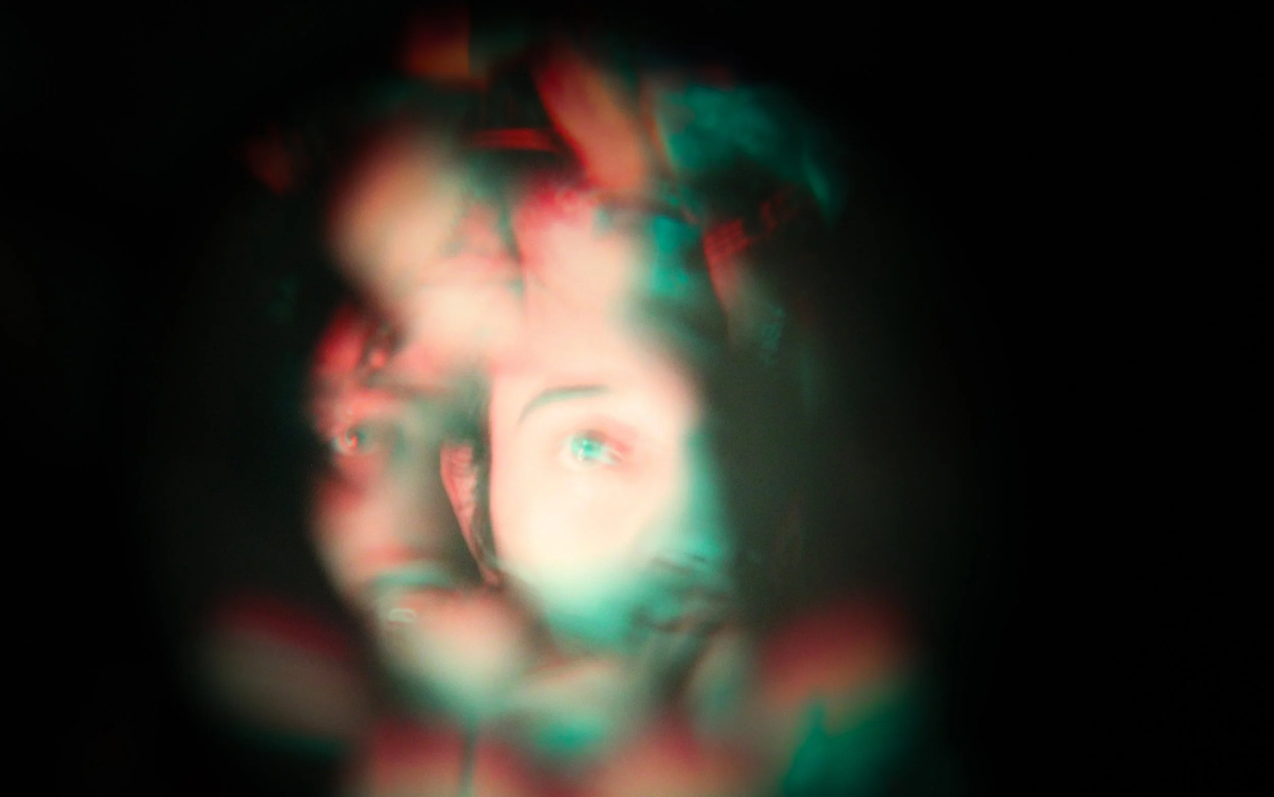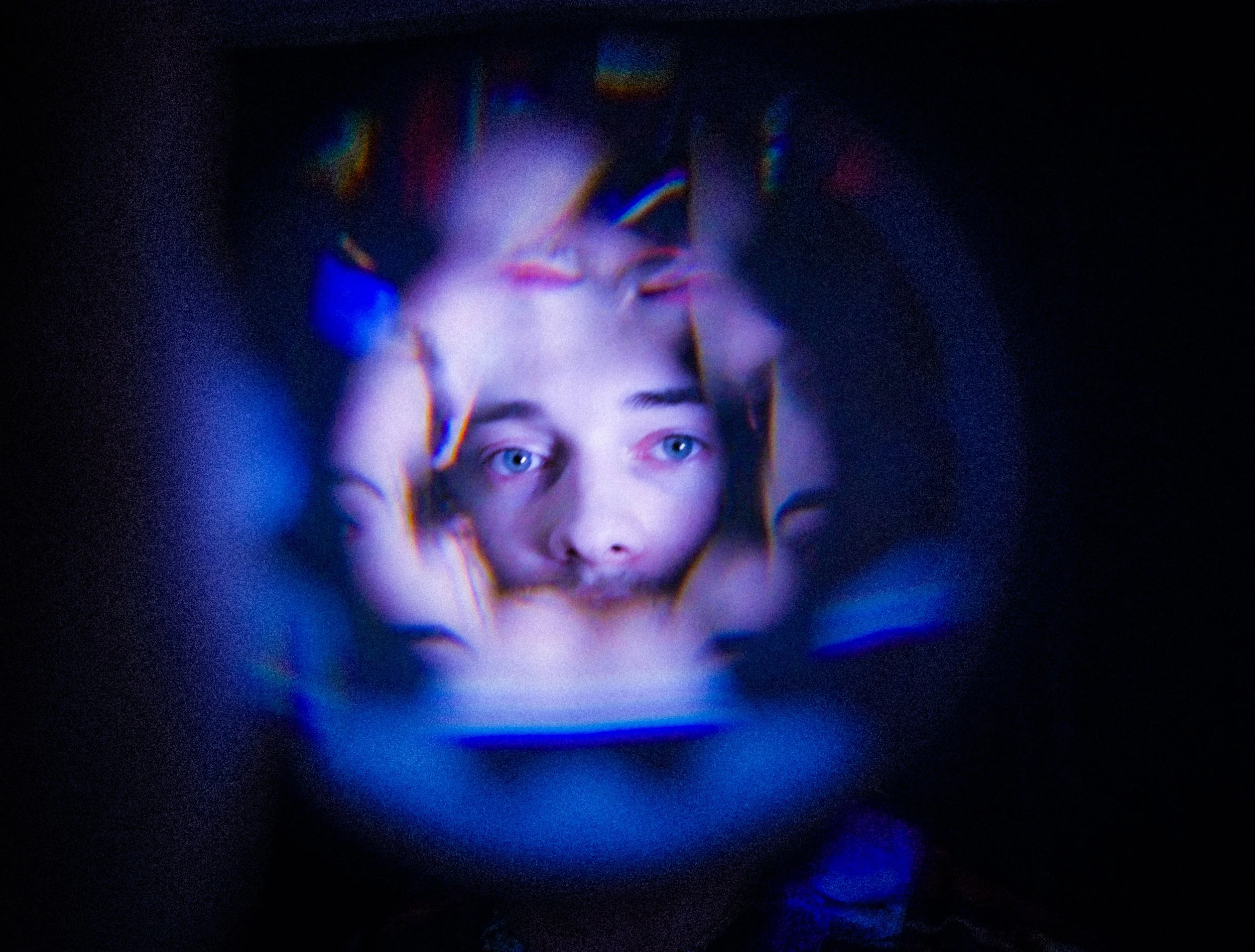 A blurred, abstract portrait of a person with visible eyes, surrounded by colorful, distorted patterns.