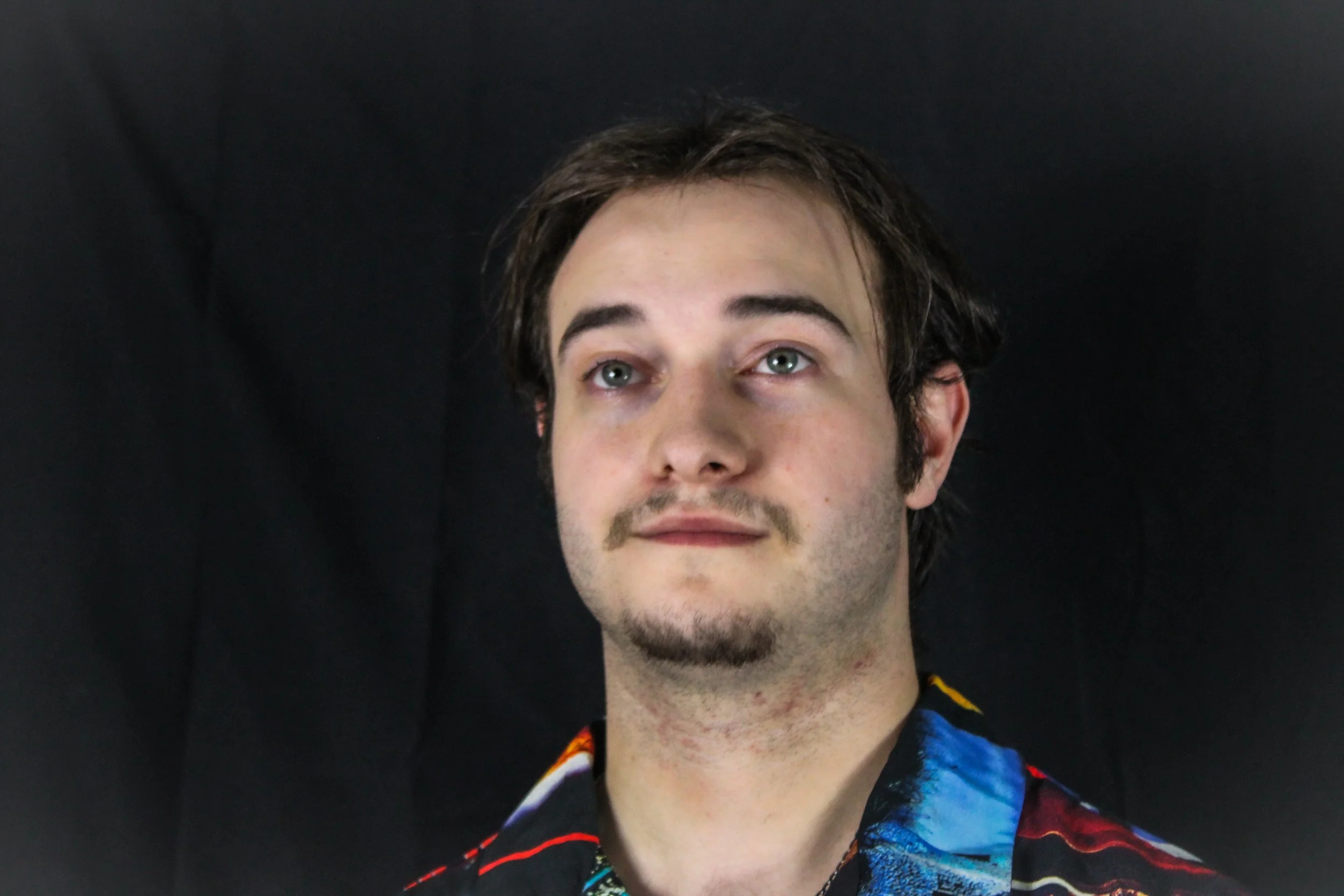 A young man with brown, slightly wavy hair, light facial hair, and light blue eyes, wearing a colorful shirt with patterns, in a black background.