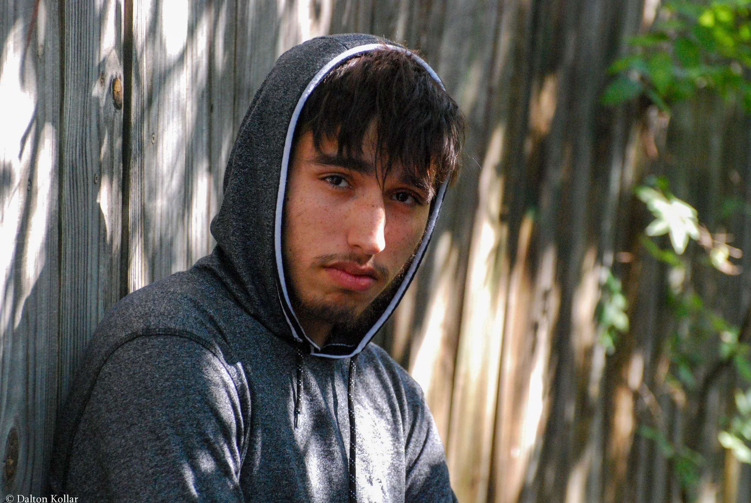 A young man with dark hair, light skin, and freckles wearing a dark hoodie, sitting against a wooden fence with greenery in the background. Zaywheezy, San Antonio, Texas