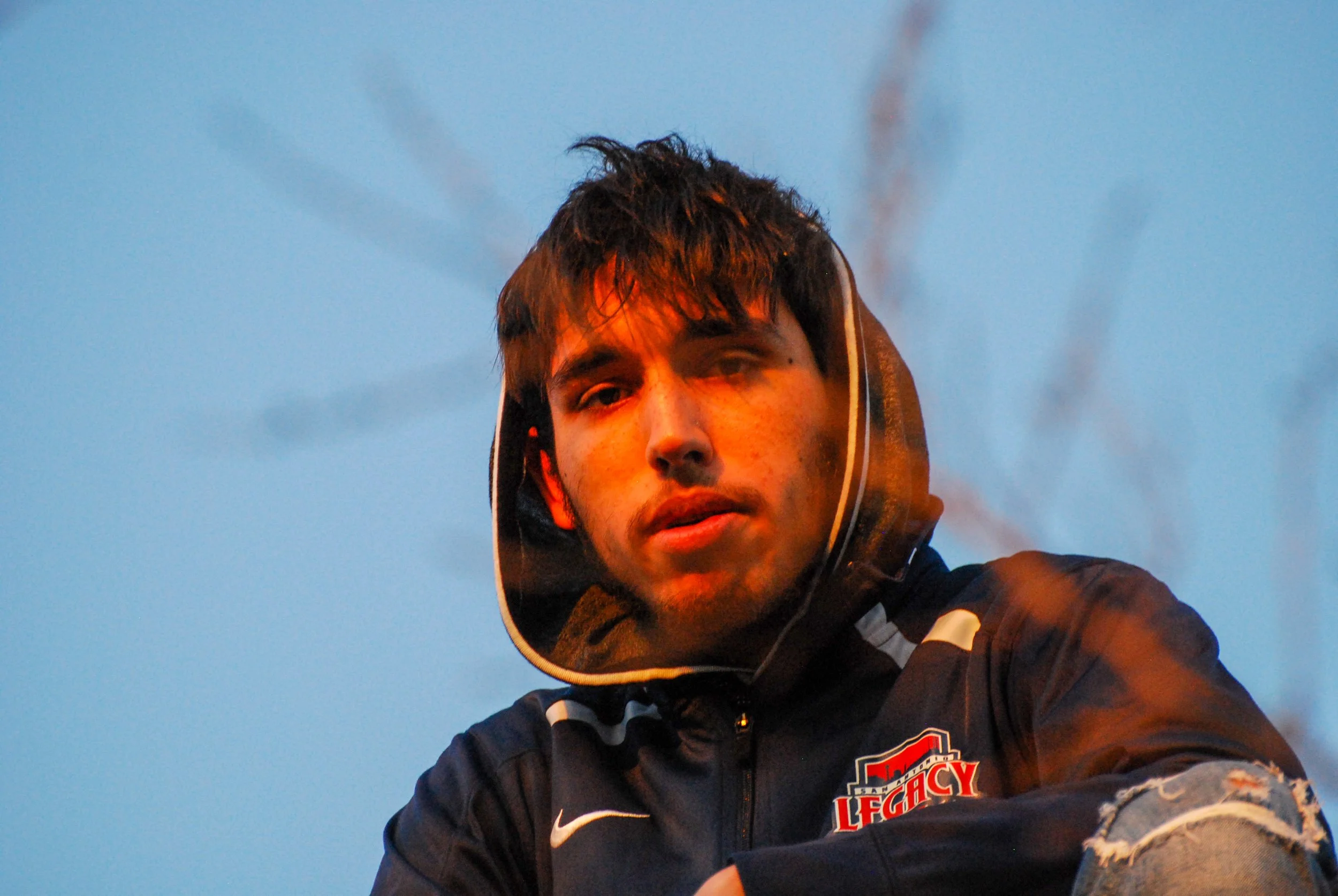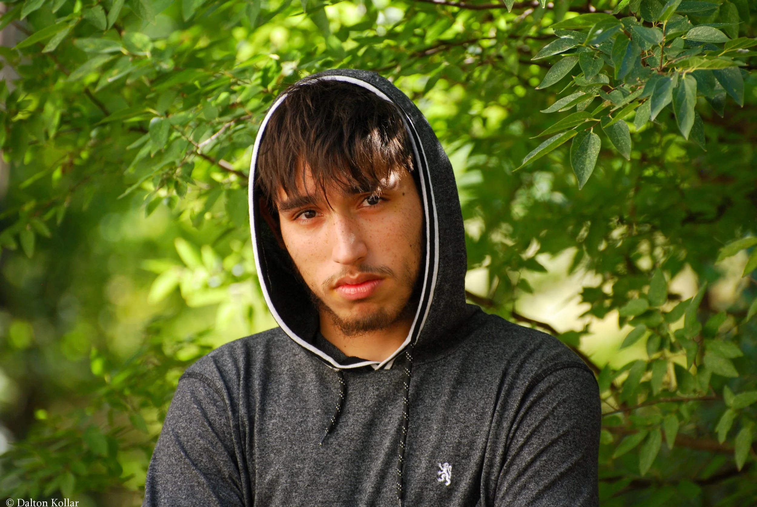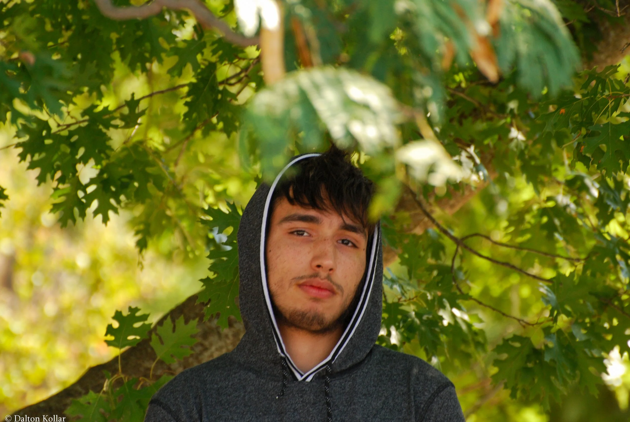 A young man with dark brown hair, light freckles, and a slight beard wearing a black hoodie with white trim, standing outdoors amidst green leafy trees.Zaywheezy, San Antonio, Texas