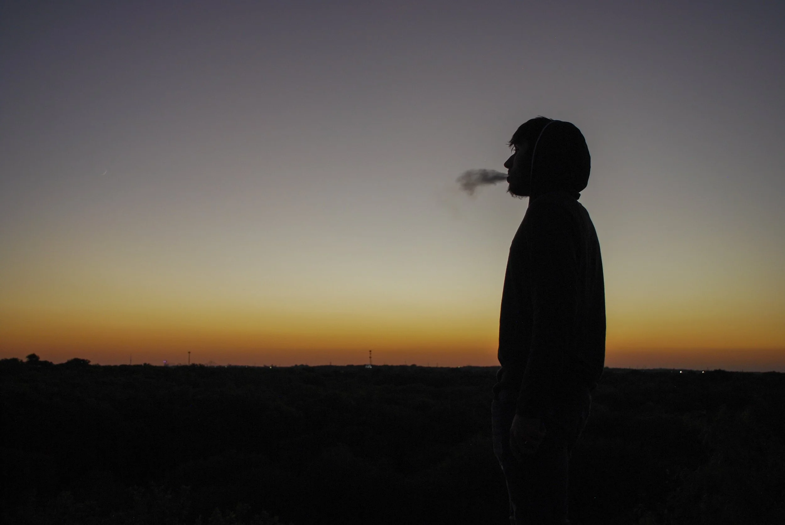 A man wearing a gray hoodie outdoors at night, exhaling vapor or smoke against a dark sky with a tree branch in the foreground. Zaywheezy, San Antonio, Texas