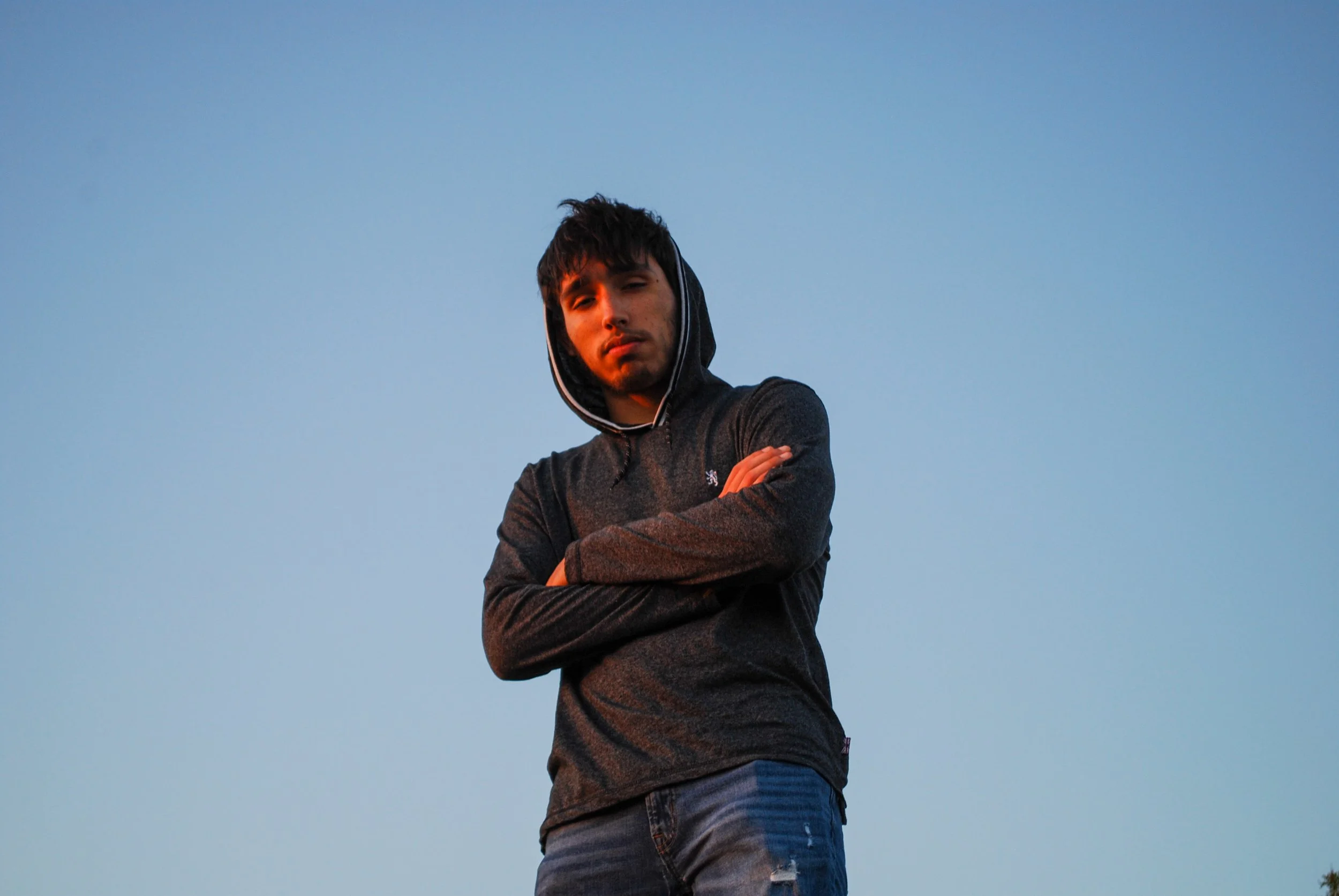 A young man standing outdoors with arms crossed, wearing a dark hooded jacket, against a clear blue sky. Zaywheezy, San Antonio, Texas