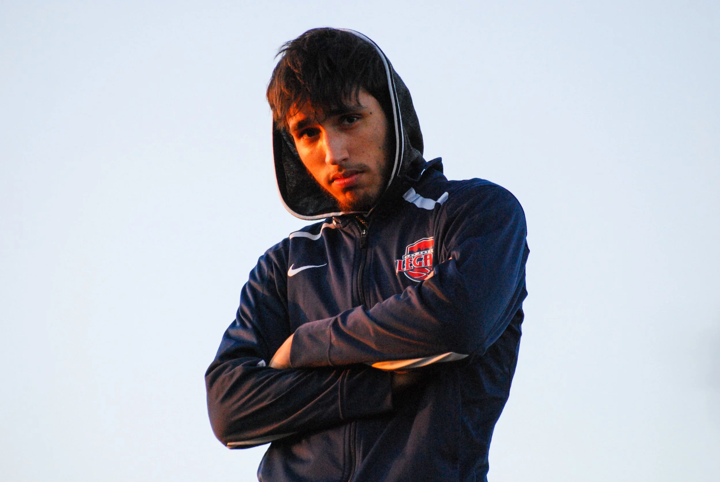 Young man with dark hair and light facial hair in a dark sports jacket with a hoodie, crossing his arms and looking at the camera against a plain background. Zaywheezy, San Antonio, Texas