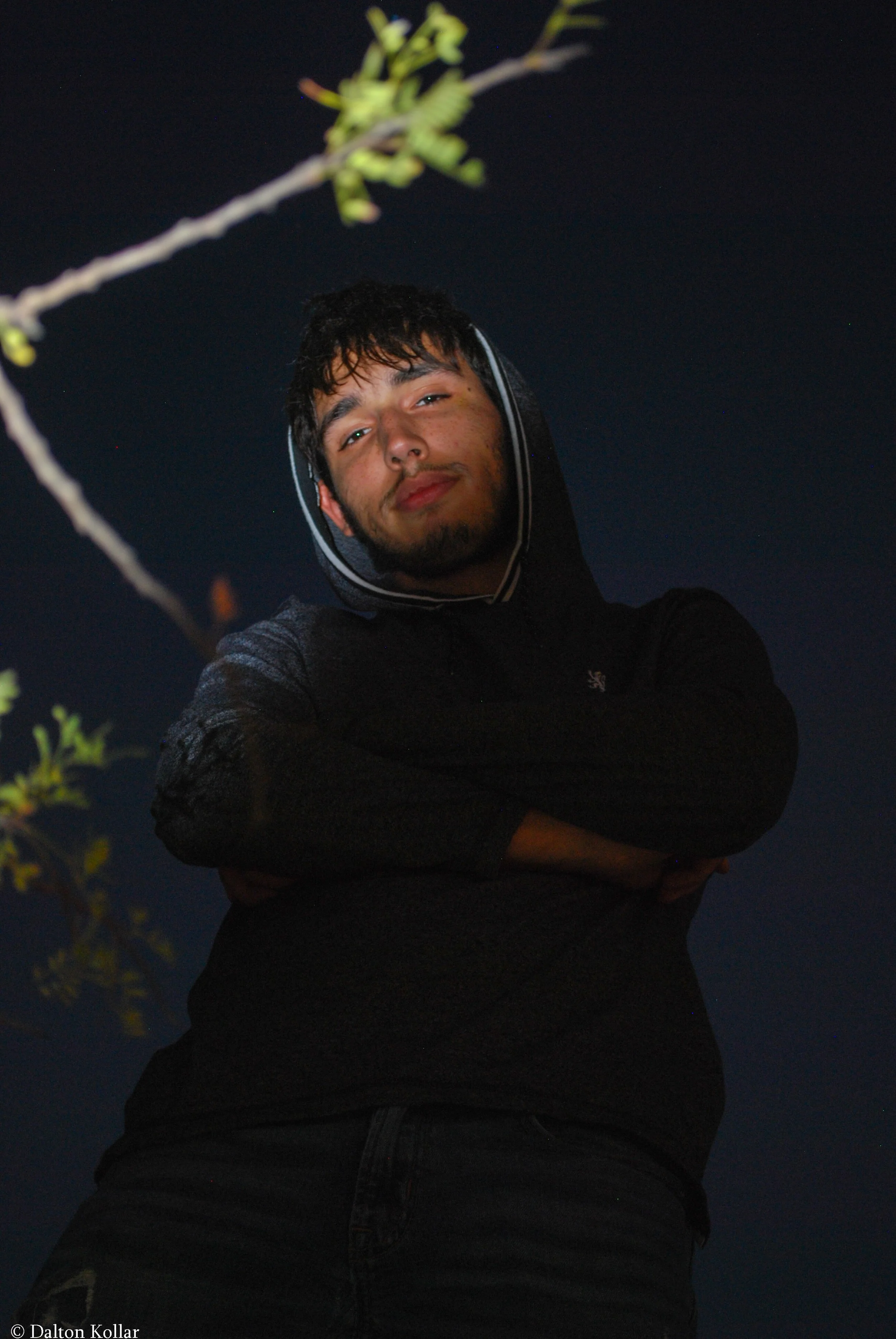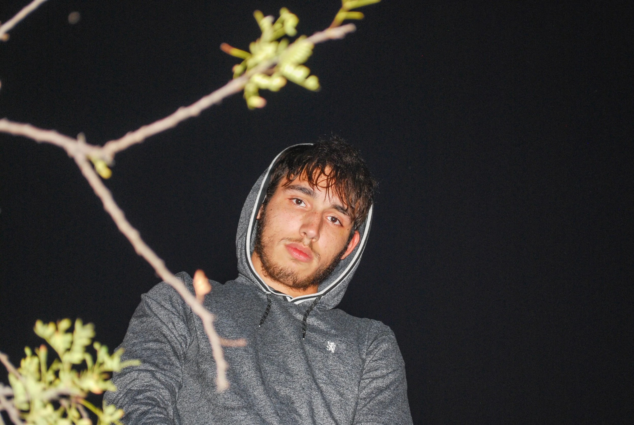 A young man with dark hair and a beard, wearing a gray hoodie with the hood up, posing outdoors at night with a dark background and some branches with small green leaves in the foreground. Zaywheezy, San Antonio, Texas
