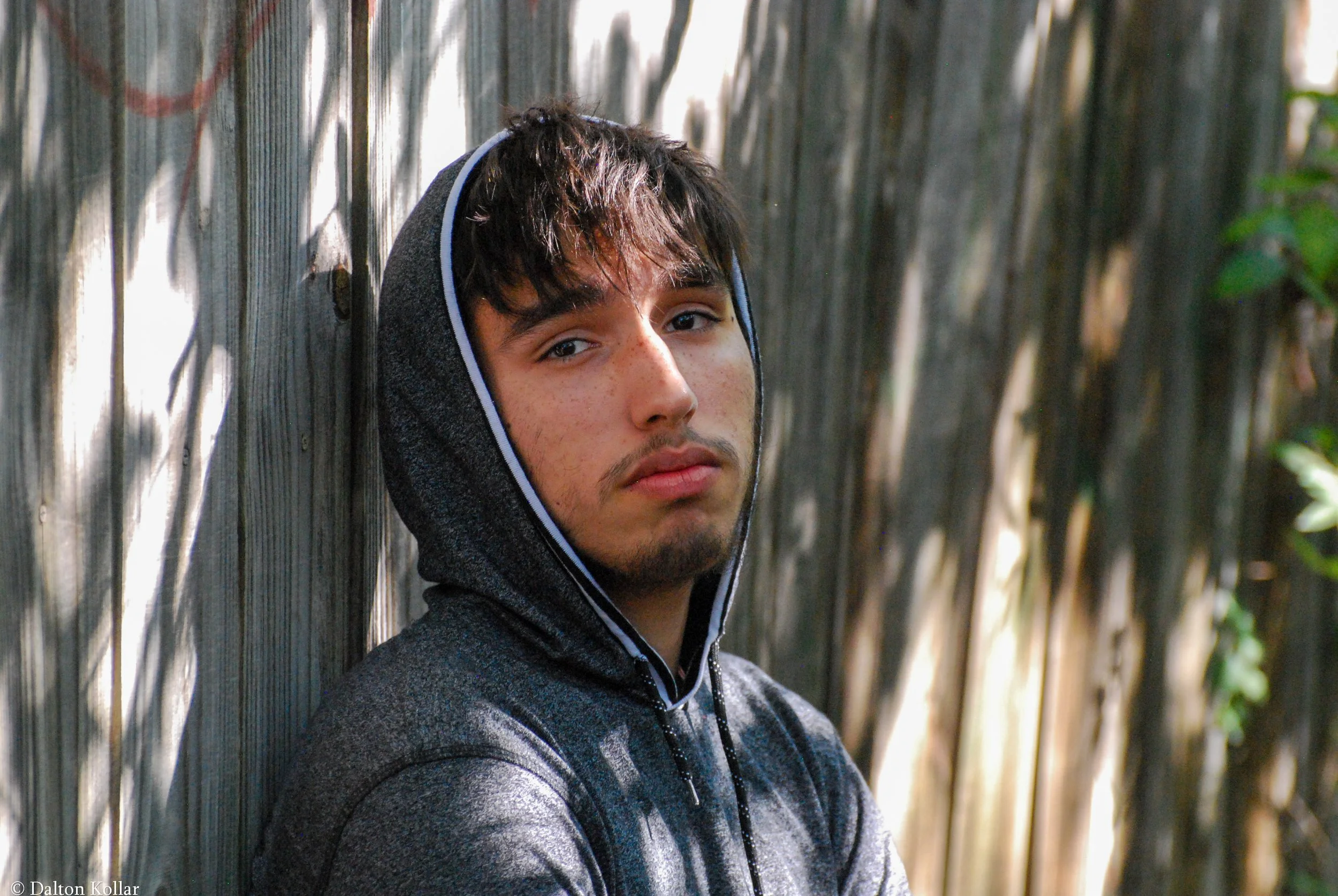 Young man with dark hair and light skin leaning against a wooden fence, wearing a dark gray hoodie with the hood up, in an outdoor setting. Zaywheezy, San Antonio, Texas