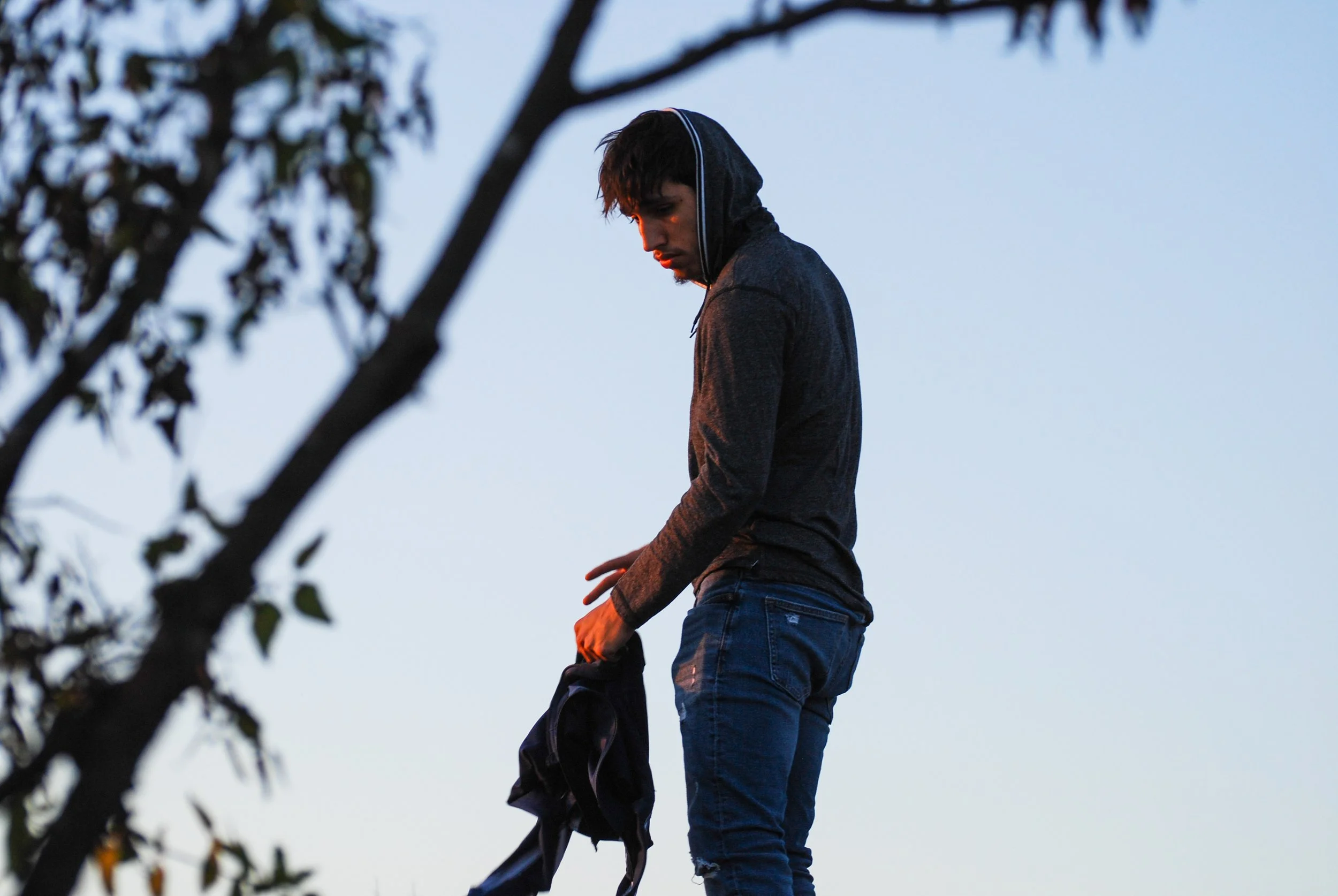 A person in a hoodie and ripped jeans hanging a jacket on a tree branch during sunset. Zaywheezy, San Antonio, Texas